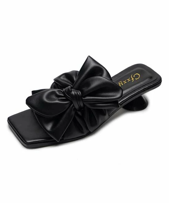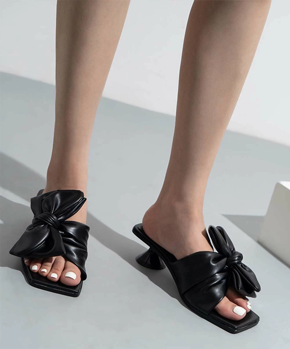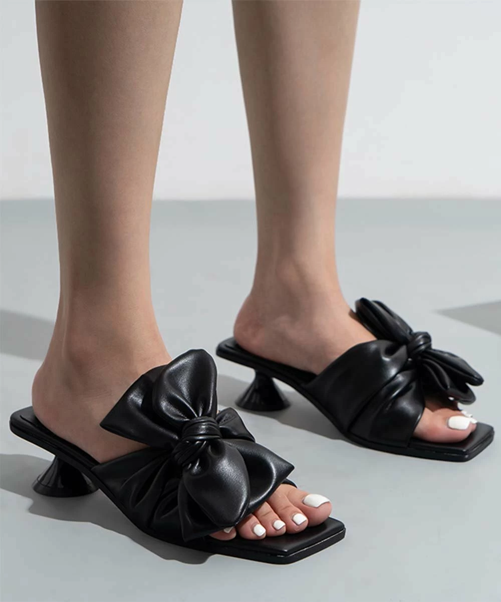 Add flair to your step with these kitten-heel slides featuring a bow detail.