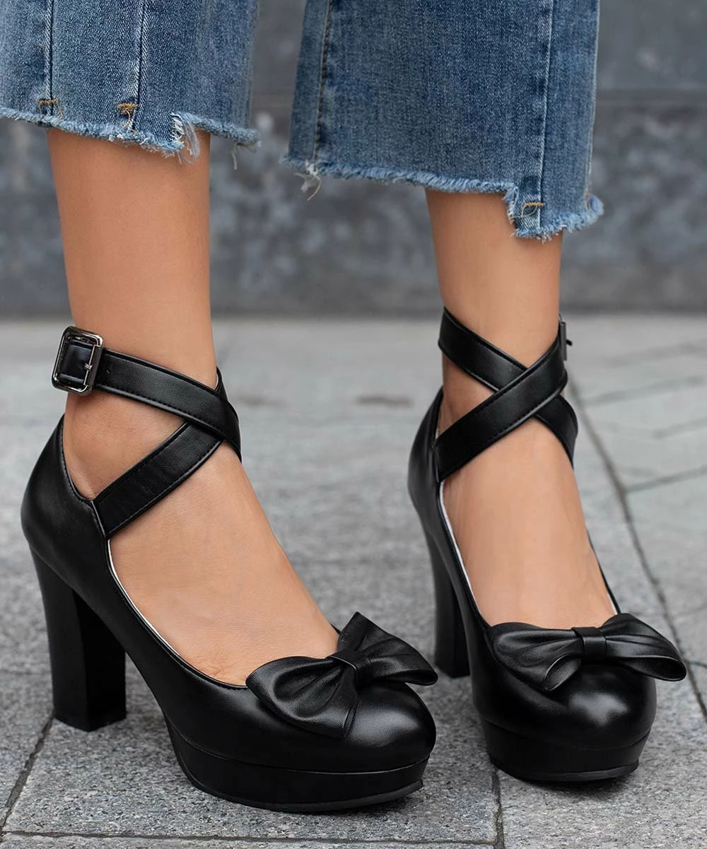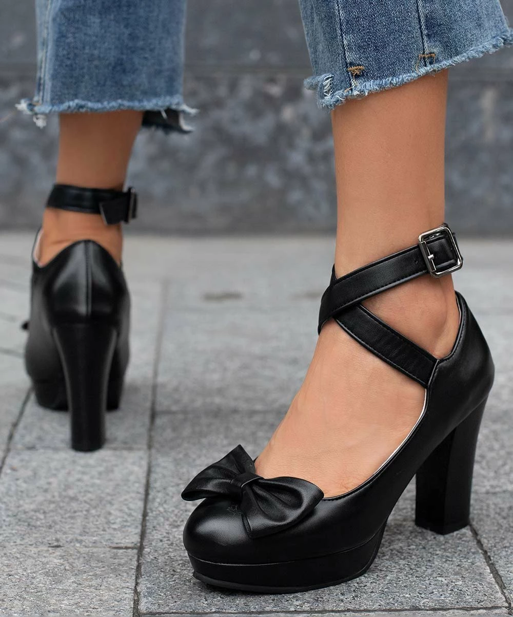 Hit your stride in these strap-detailed pumps featuring a graceful heel and a bow accent at the toe.