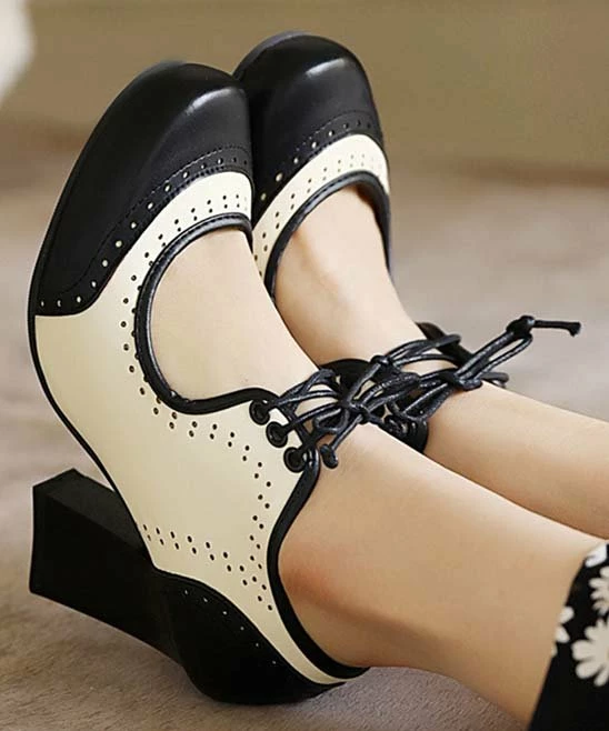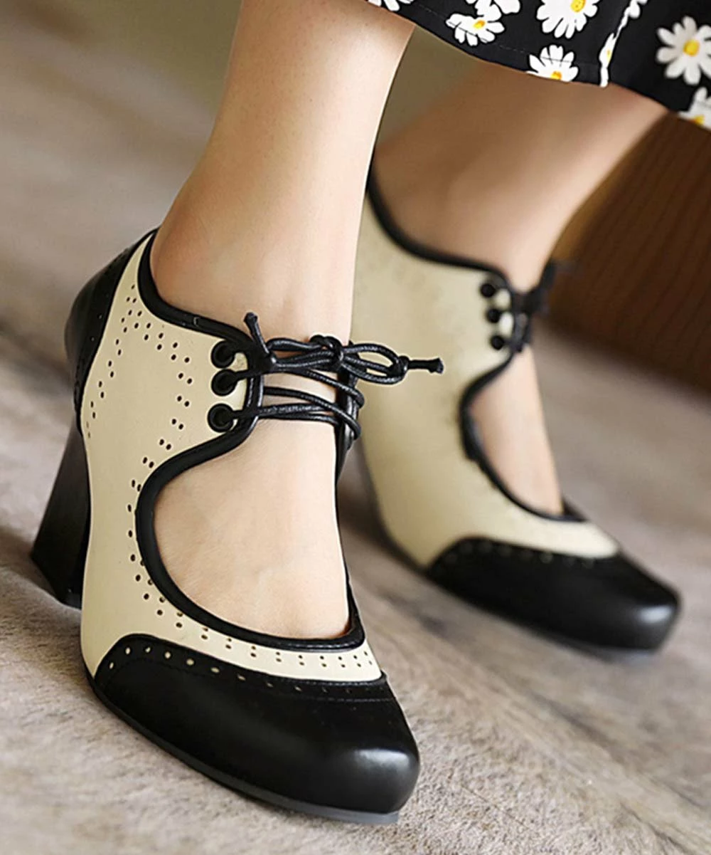 Complete your fashionable looks with the retro-inspired appeal of these lace-up pumps featuring contrasting colors and perforated detailing.