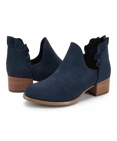 A deep side cut and ruffle trim elevate these chunky-heel ankle boots.