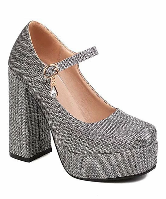 Ankle-strap pumps complete with a block heel and a rhinestone buckle charm.