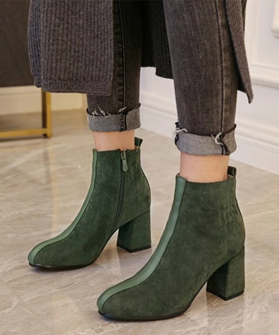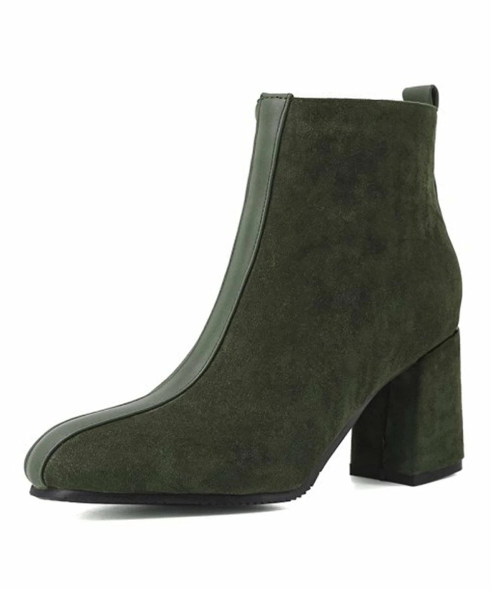 Update your cool-weather looks with these block-heel booties featuring a contrast panel running from the topline to the toe. Side zip for easy wear.