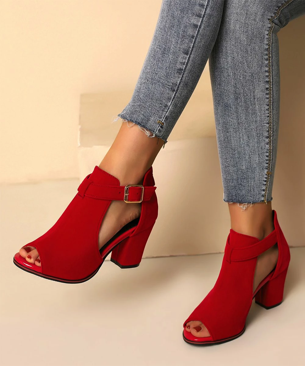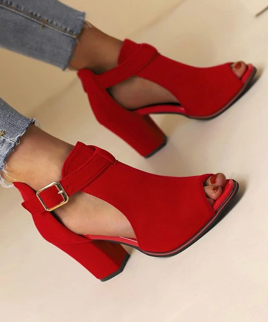 Step out in elevated style in this playful high-heeled shoe complete with a thick heel, an adjustable buckle strap and a flirty peep-toe for showing off your latest pedicure.