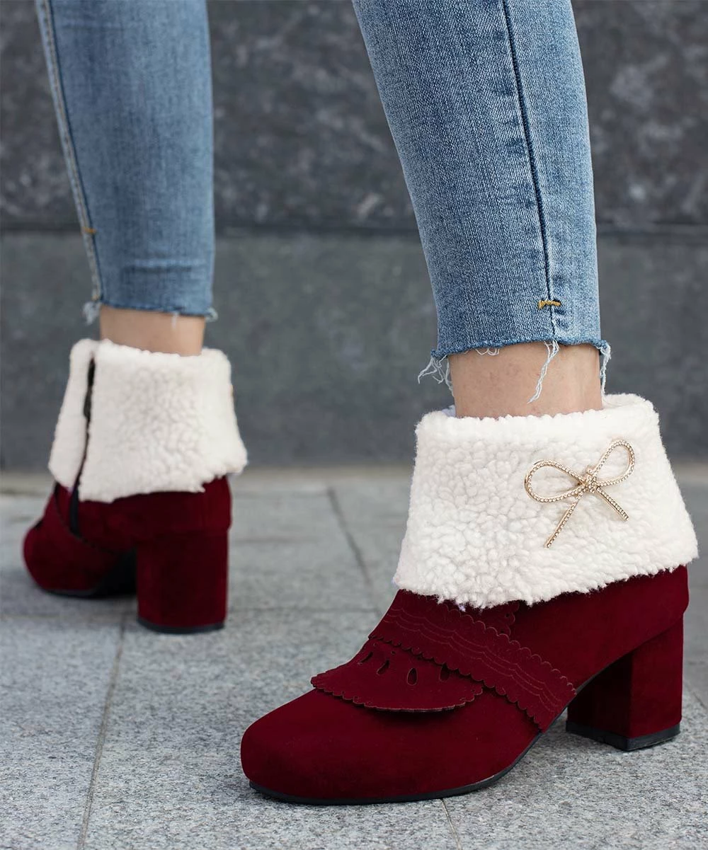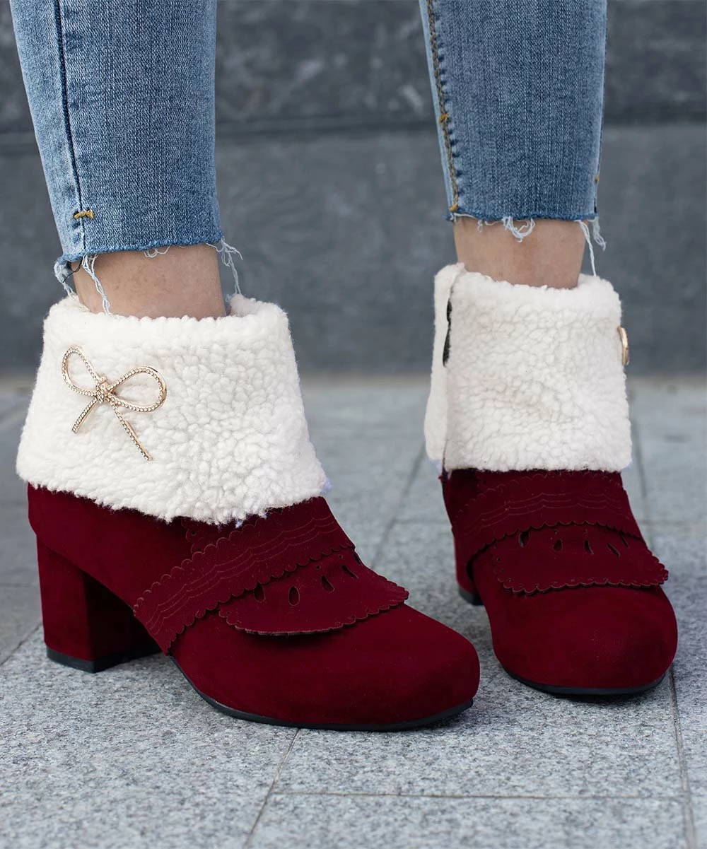 These cozy faux fur-cuff booties have a bow accent, block heel and a soft rubber sole for a comfortable stride.