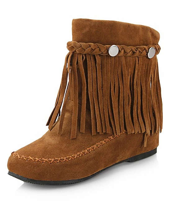 Western meets cozy-chic in this slipper-like boot lined with fuzzy fabric and adorned with studded accents and lengthy fringe.